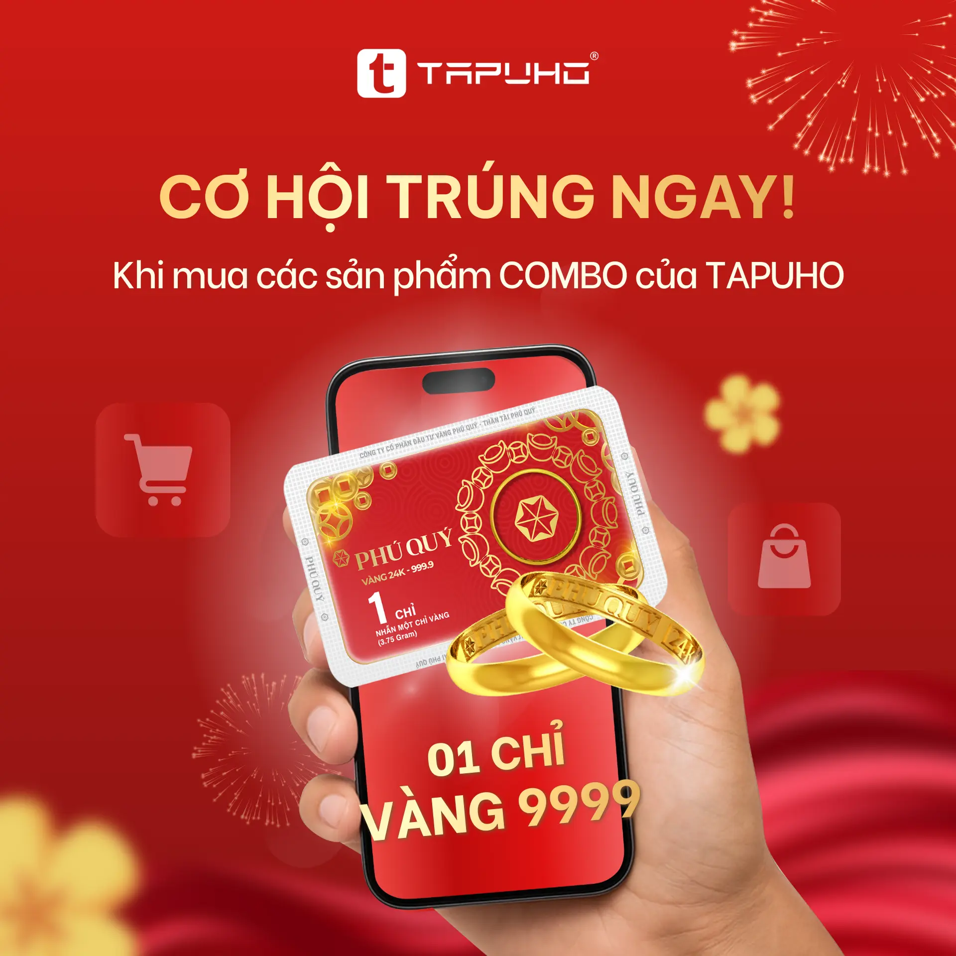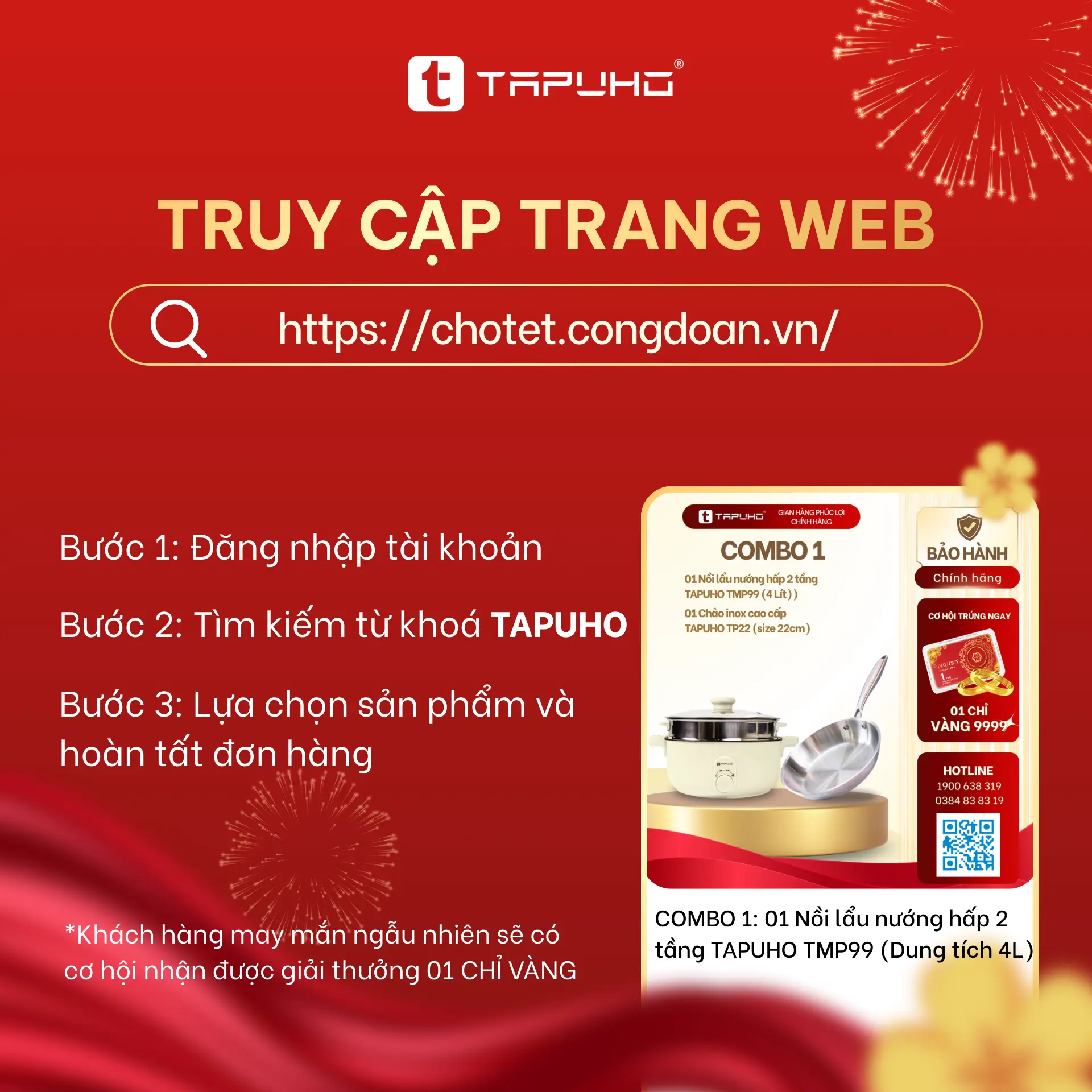 Khách hàng phát sinh đơn hàng hợp lệ của TAPUHO trong thời gian diễn ra Chợ Tết Công Đoàn 2026 sẽ có cơ hội được TAPUHO lựa chọn ngẫu nhiên để trao tặng 01 chỉ vàng như một lời tri ân đầu năm.