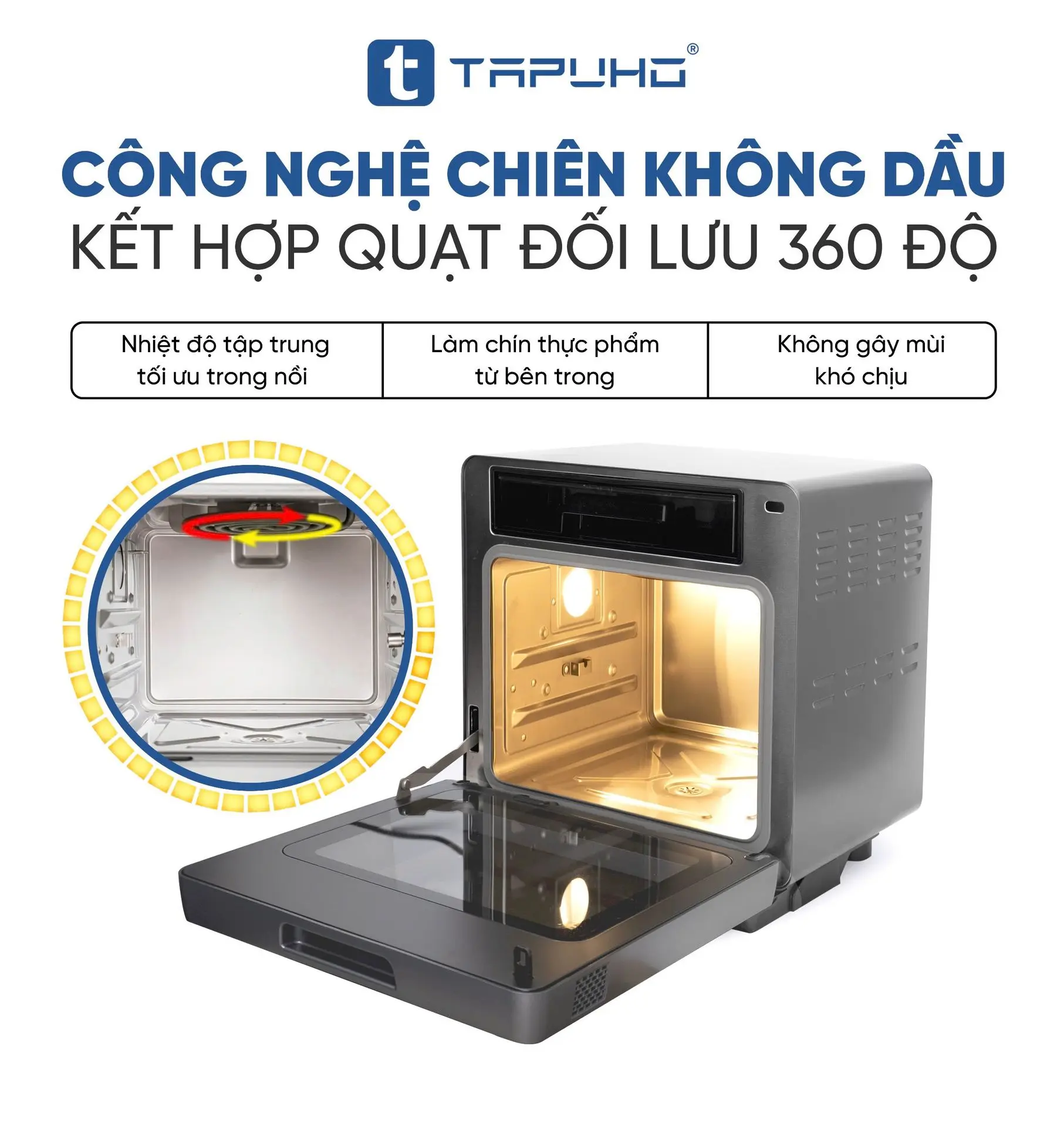 - Nồi chiên hơi nước TAPUHO LUXURY STEAM FRYER TSF16 SmartX có 1 công tắc an toàn, đảm bảo khi đóng cửa nồi, nồi mới hoạt động và khi cửa chưa được đóng chặt thì nồi sẽ không hoạt động.