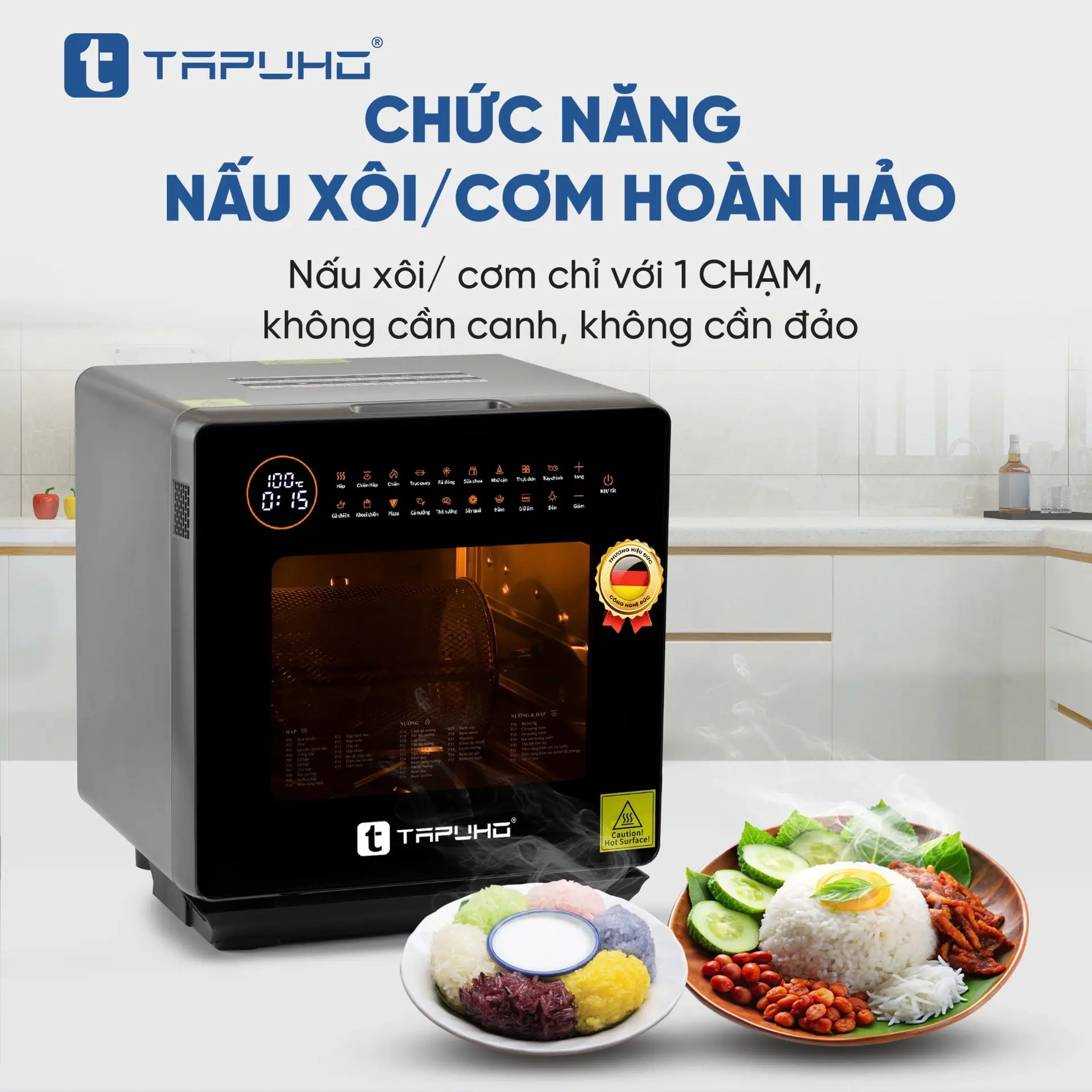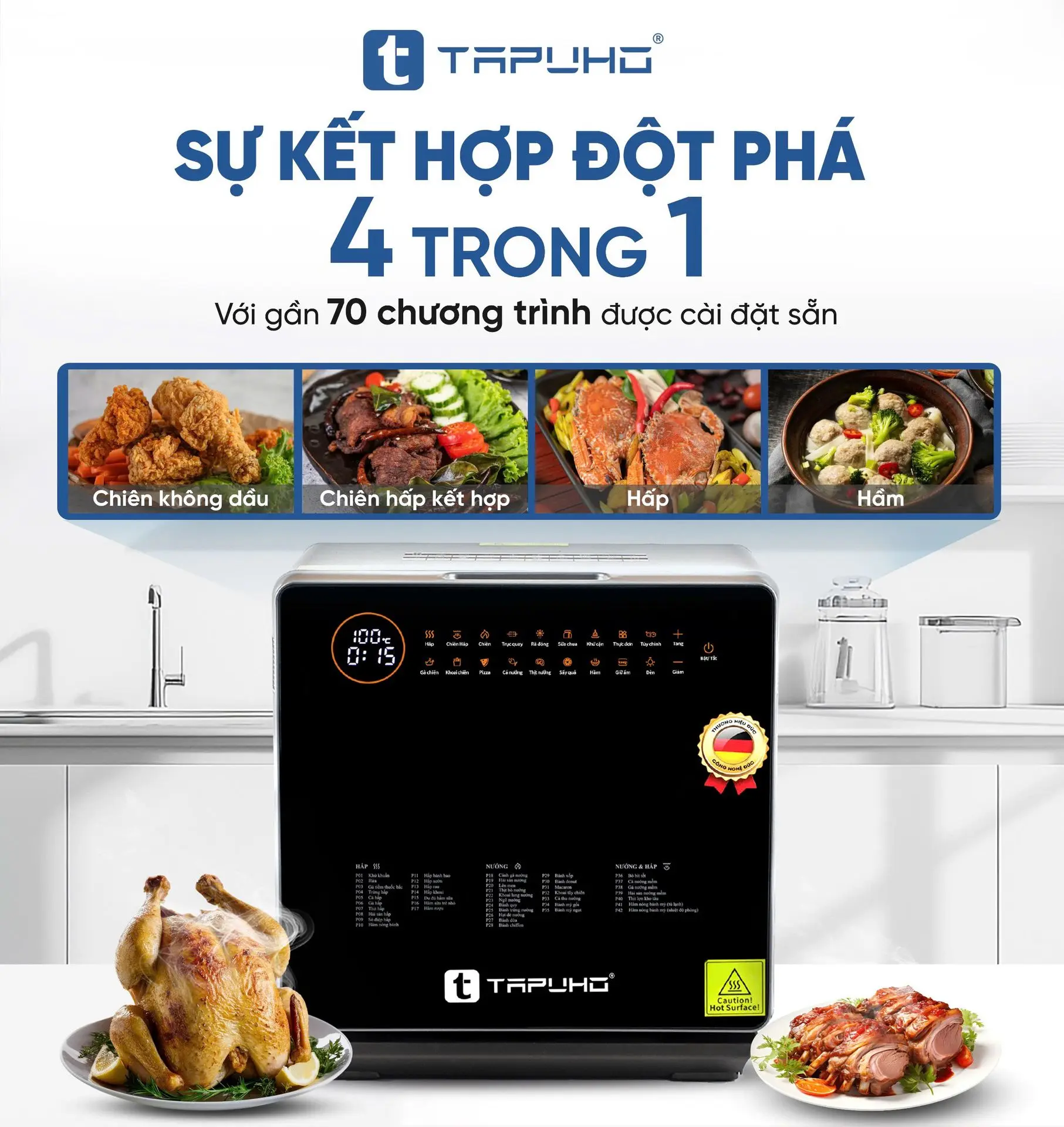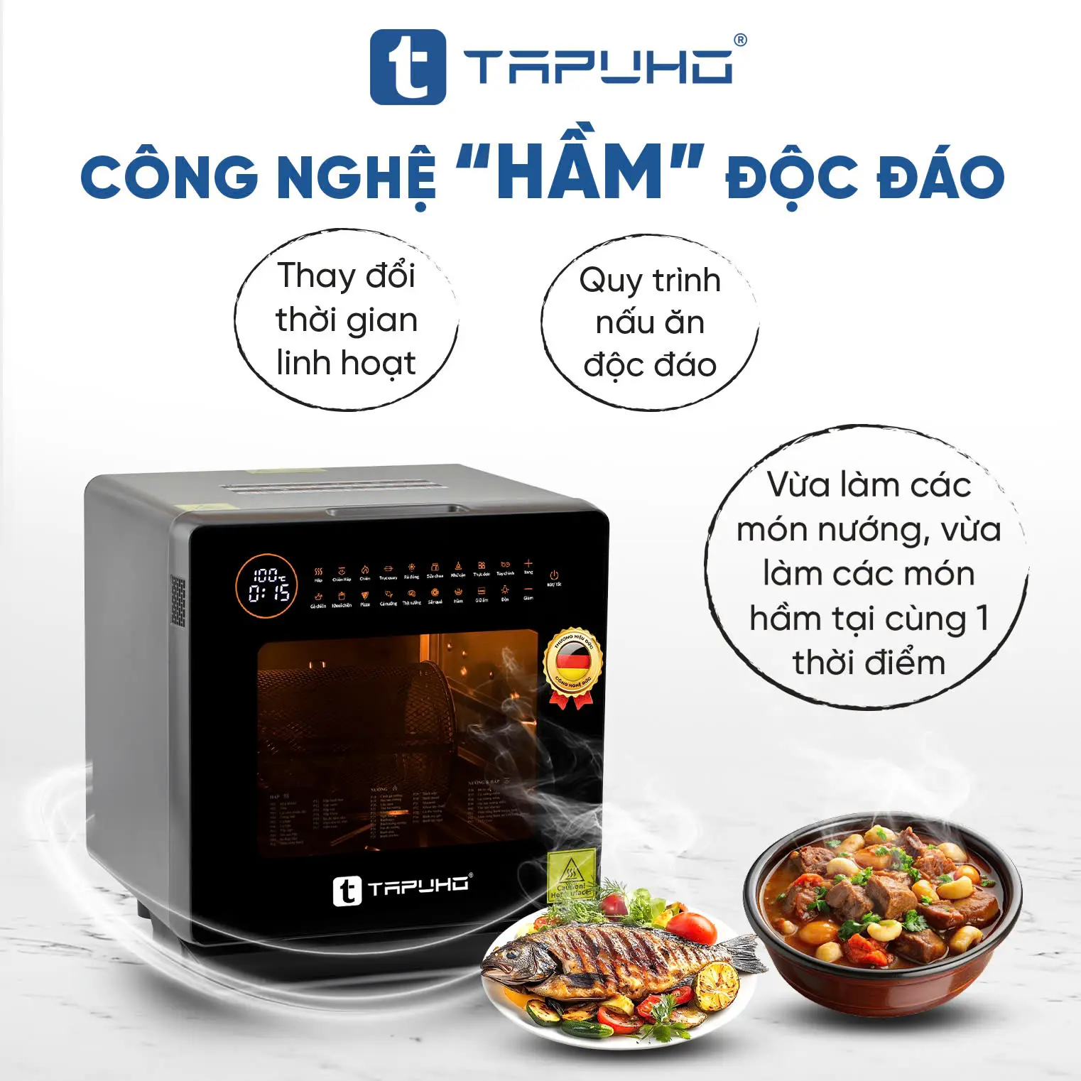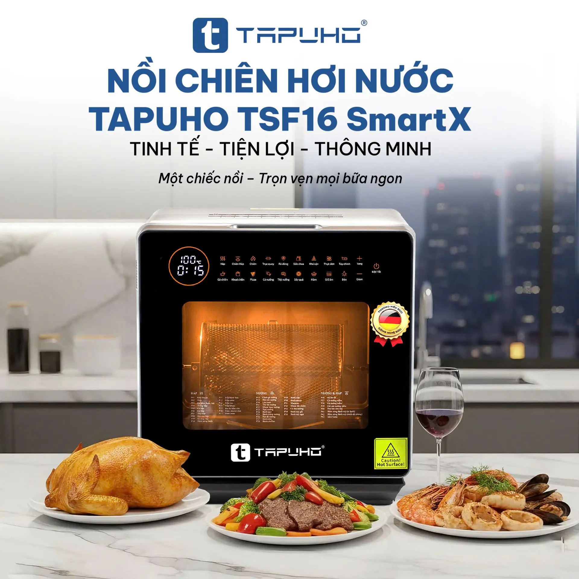 TAPUHO LUXURY STEAM FRYER TSF16 SmartX là sản phẩm nồi chiên hơi nước mới nhất của TAPUHO - thương hiệu gia dụng cao cấp đến từ Đức. Đây là dòng sản phẩm mang tính đột phá, bùng nổ công nghệ với sự kết hợp giữa nồi chiên không dầu (công nghệ rapid air) và nồi hấp (công nghệ hơi nước siêu nhiệt steam pro) mang đến sự tiện lợi cho khách hàng, ngoài ra nó còn là sự kết hợp 4 tính năng trong 1, đó là tính năng Hấp - Chiên không dầu - Chiên hấp kết hợp - Hầm và đặc biệt có những chức năng chỉ có trên TAPUHO LUXURY STEAM FRYER TSF16 SmartX mà chưa từng có trên bất kỳ sản phẩm cùng loại nào trên thị trường.
