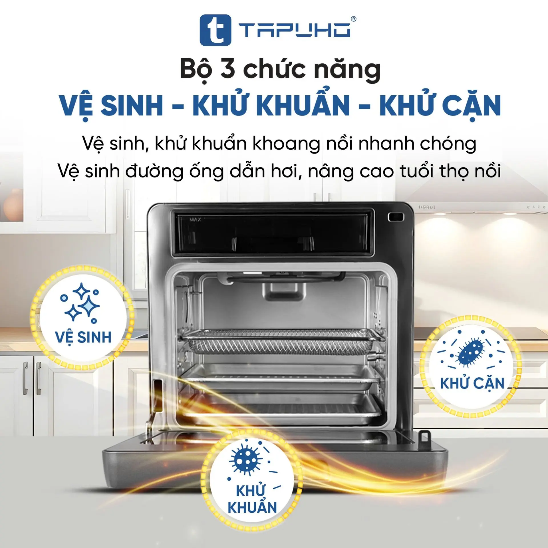 Nỗi lo không gian bếp chật hẹp không đủ không gian để chứa các thiết bị nhà bếp sẽ không còn nữa khi TAPUHO LUXURY STEAM FRYER TSF16 SmartX có thể sử dụng chức năng tương đương với 10 thiết bị nhà bếp khác nhau như : nồi chiên không dầu, nồi hấp, nồi áp suất, máy sấy hoa quả, máy ủ sữa chua, lò nướng, lò vi sóng, máy làm bỏng ngô, máy nướng bánh mỳ, ... và đặc biệt với tính năng đa dạng như vậy sẽ giúp chúng ta tiết kiệm được rất nhiều chi phí mua sắm, thời gian vệ sinh bảo dưỡng.