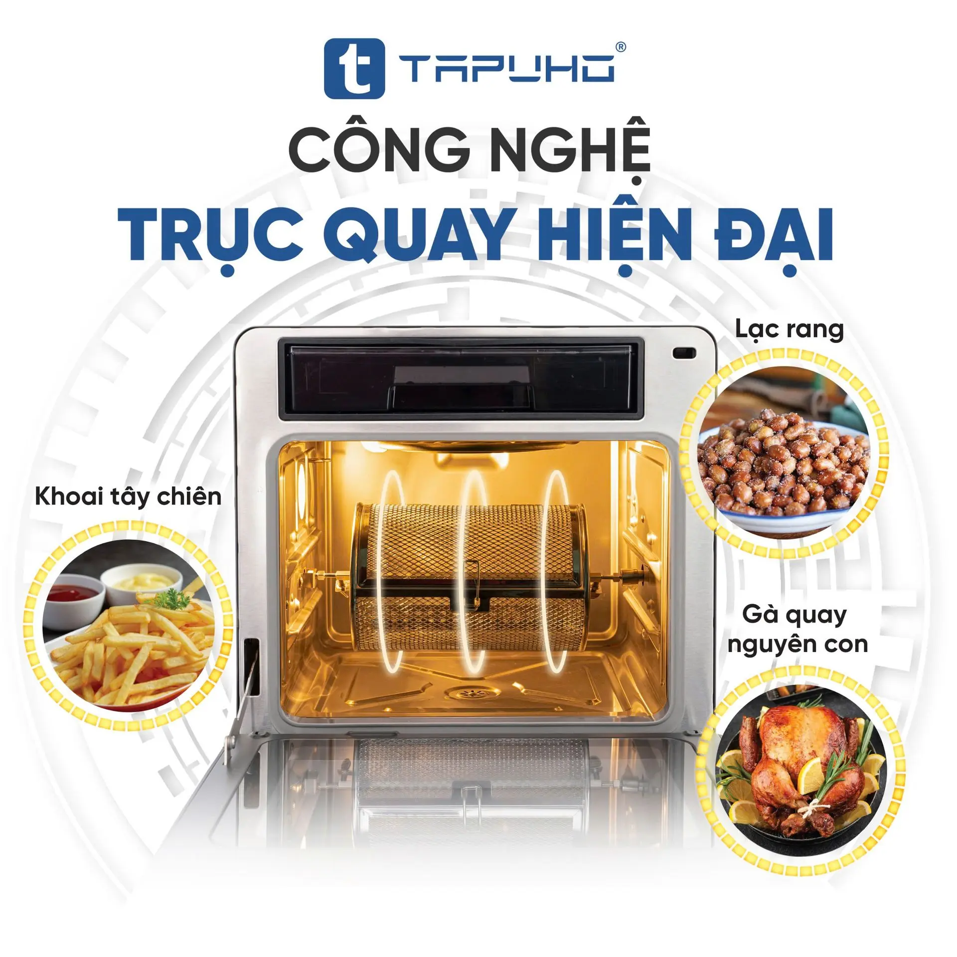 Hiện nay các dòng nồi chiên hơi nước trên thị trường, chưa có sản phẩm nào có chức năng quay tự động kèm phụ kiện lồng chiên và nhông quay (chức năng này chỉ có ở các dòng nồi chiên không dầu thông thường). Với chức năng này chúng ta có thể chiên cả con gà quay tự động, chiên khoai tây, rang lạc...chín đều mà không cần cắt nhỏ nguyên liệu, không cần bất kỳ thao tác lật trở nào, mang lại sự tiện dụng tối đa cho người tiêu dùng.